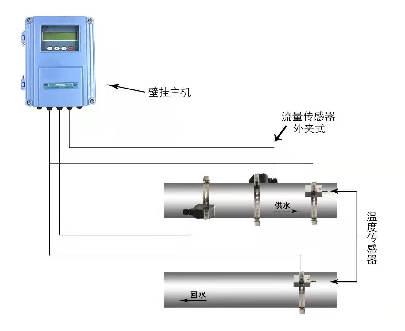 外缚式传感器是将传感器直接捆绑在被测管道的外表面从而实现流量测量的一种安装方式,具有与管径无关、安装简单、无需停产、无压力损失等特点